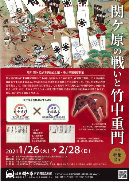 新型コロナウィルス感染に関して、当県を含めた国の緊急事態宣言が解除されましたので、特集展示「関ケ原の戦いと竹中重門」の会期を4月11日(日)まで延長します。