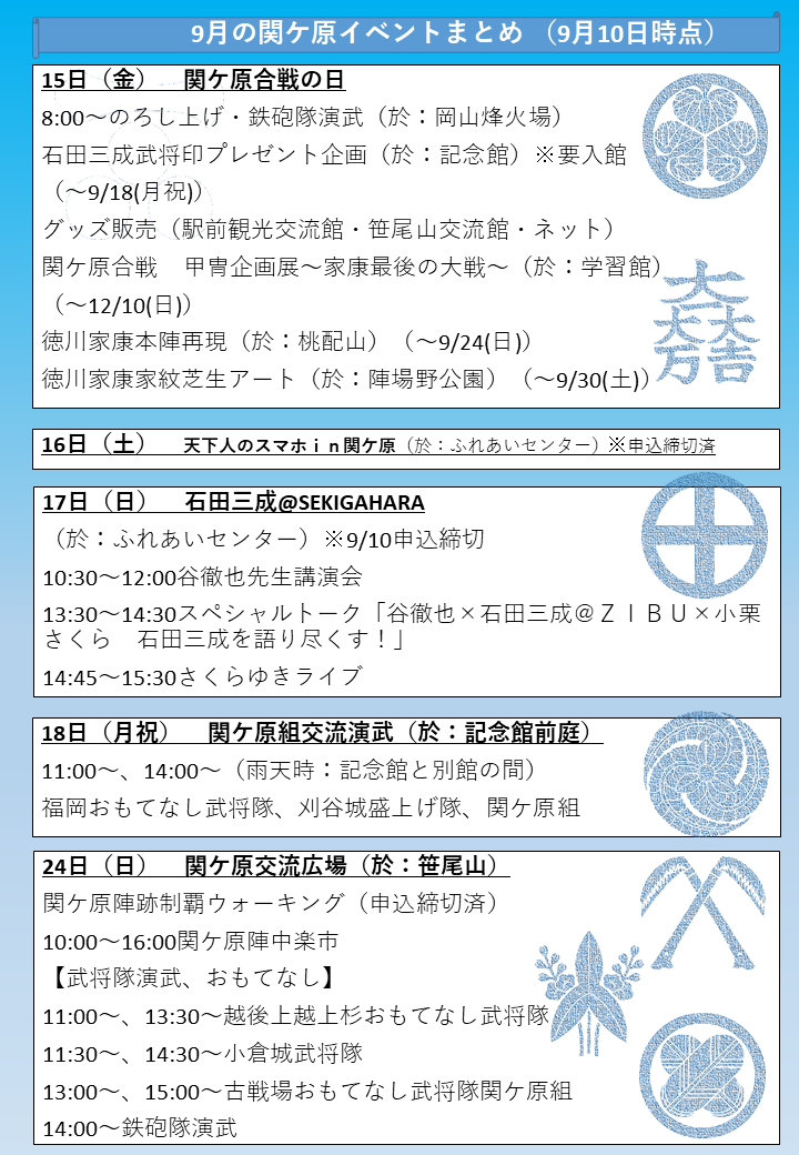 2023年9月10日 9月に関ケ原で開催されるイベントについて 9月15日(金)以降に関ケ原合戦の日以降に関ケ原で行われるイベントをまとめました。 最新の情報は当館HPや関ケ原観光情報(https://www.sekigahara1600.com/)などで随時ご確認ください。